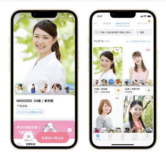 ご自身の理想に近い方を条件設定して検索することも可能。例えば、お住まいの地域、年齢や年収、共通の趣味など、様々な項目で設定して検索できます。